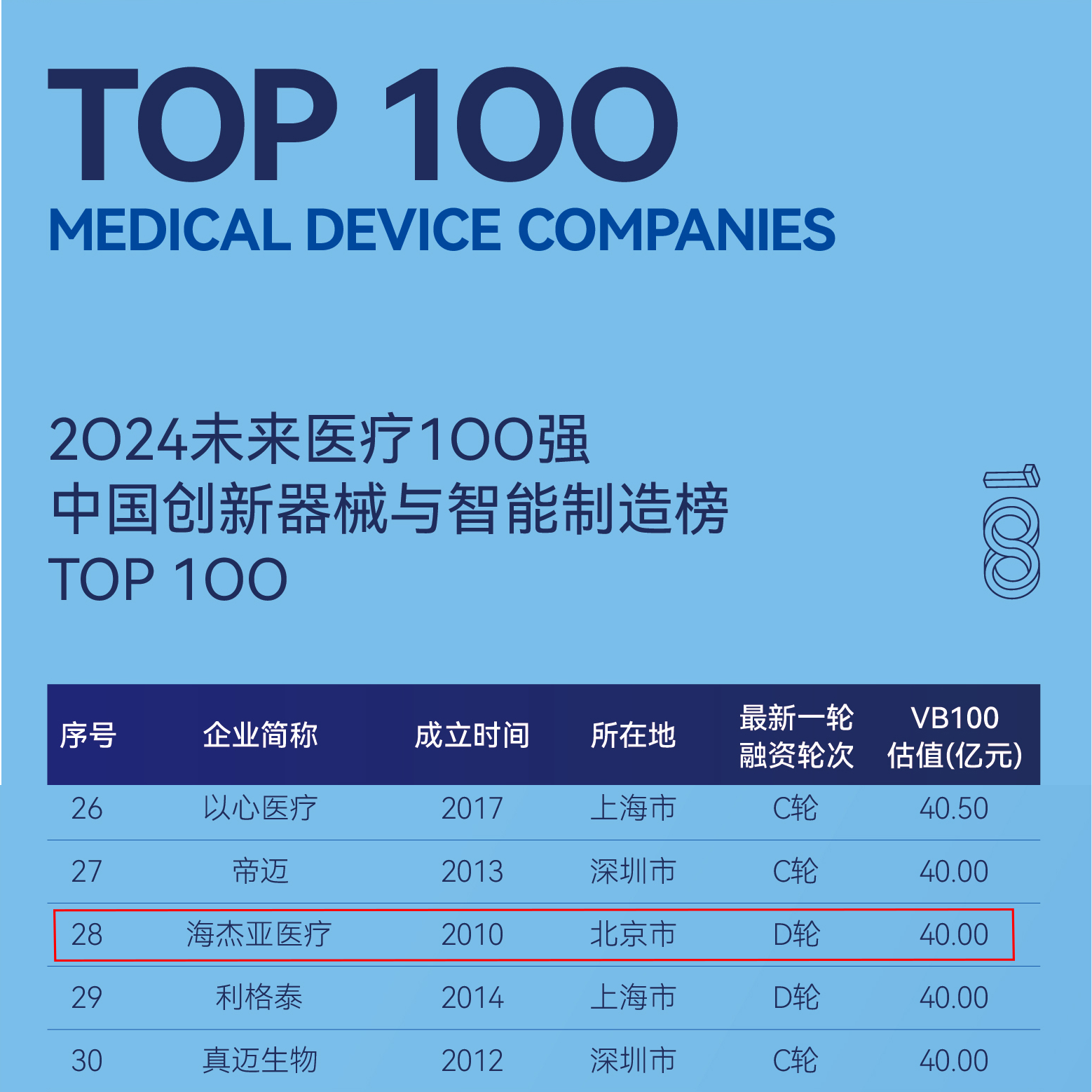 2024年5月9日,第八屆未來醫(yī)療100強榜單發(fā)布,海杰亞醫(yī)療再次入選2024未來醫(yī)療100強主榜中國創(chuàng)新器械與智能制造榜TOP100,同時,康博刀?「易」系列復(fù)合式冷熱消融系統(tǒng)入選VBEF醫(yī)療健康產(chǎn)業(yè)創(chuàng)新力產(chǎn)品榜。