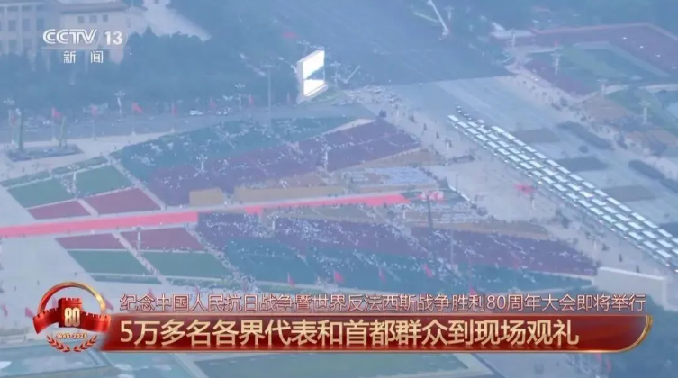 今天,數十位國際政要應邀來華蒞臨現場,各界代表和首都群眾在長安街南北兩側現場近距離觀禮。從空中可以清晰地看到,廣場上觀禮區的布局呈現出三個“人”字,構成了意象化的“眾”字,體現了眾志成城的意涵。